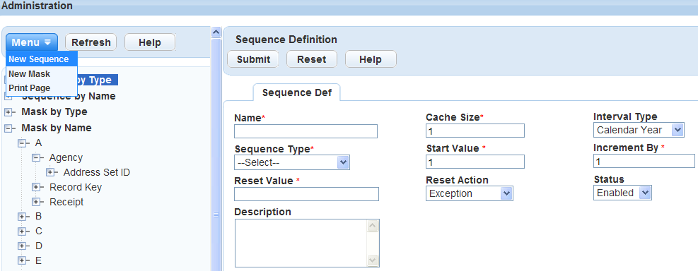 Sequence Type Groups of related sequence definitions. The groups are: Asset ID, Invoice, Record ID, Partial Record ID, Temporary Record ID, Record Key, Receipt, and Agency. One exception to this grouping is the Agency type which groups all single definitions together. Each Sequence Type must have a unique Name.