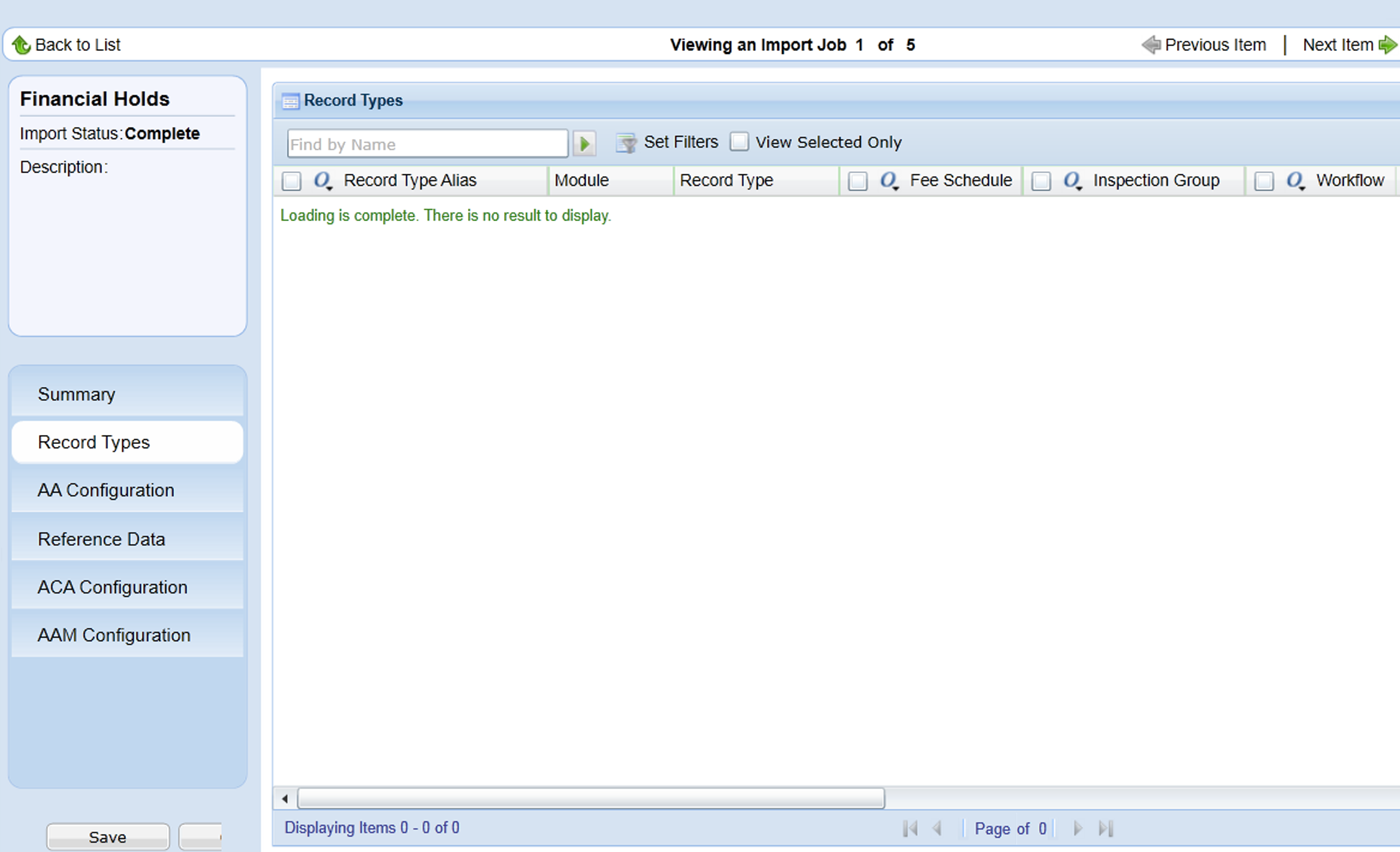 When you select record types for inclusion in an import or export job, the related data from the record type is automatically selected in the relevant configuration sections of the tool. For example, if a record type is selected and saved, the same Fee in that record type is automatically selected in the Fee section of AA Configuration.