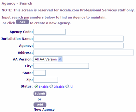 2. On the Agency - Search page, enter search criteria in any or all of the fields to find the desired agency.