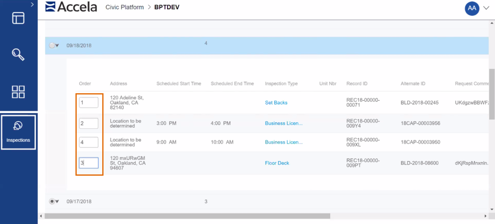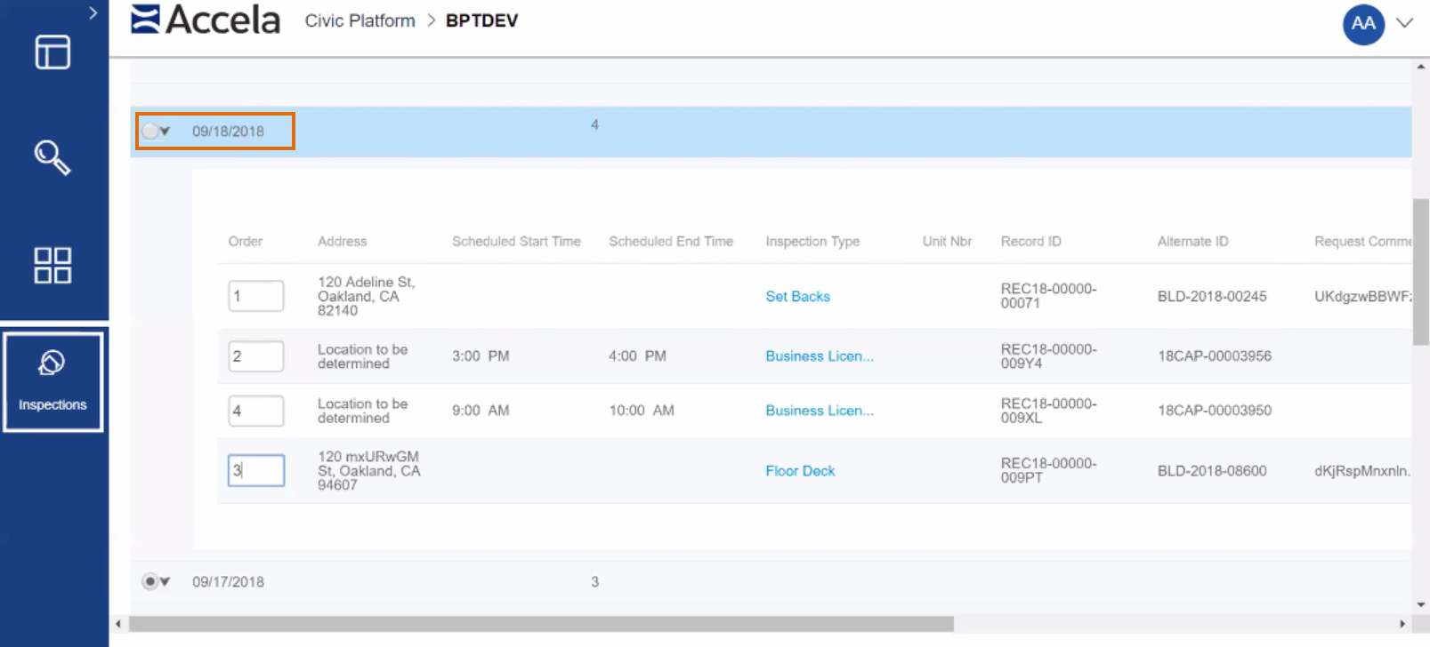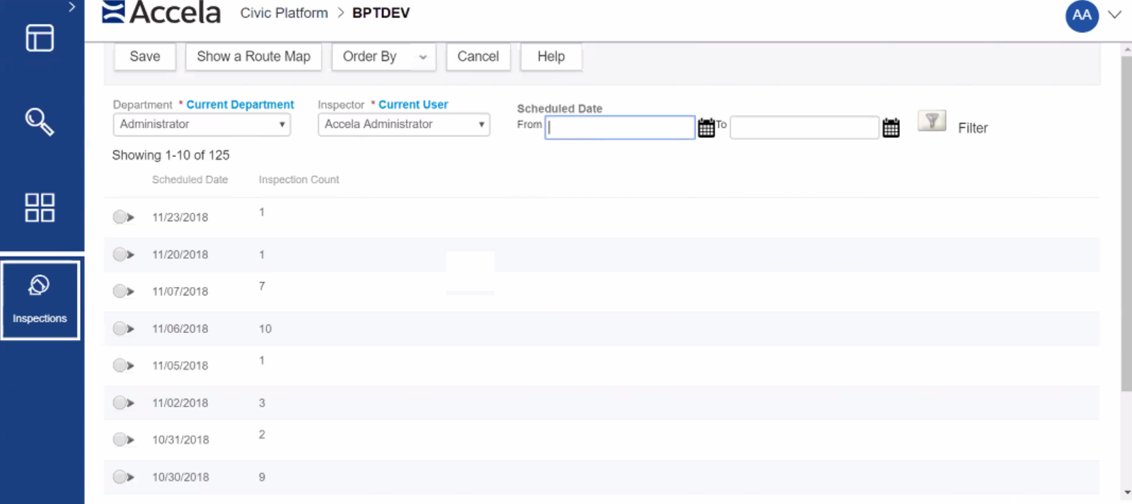 - Navigate to the Inspections page from the Launchpad. Civic Platform displays a list of inspections.