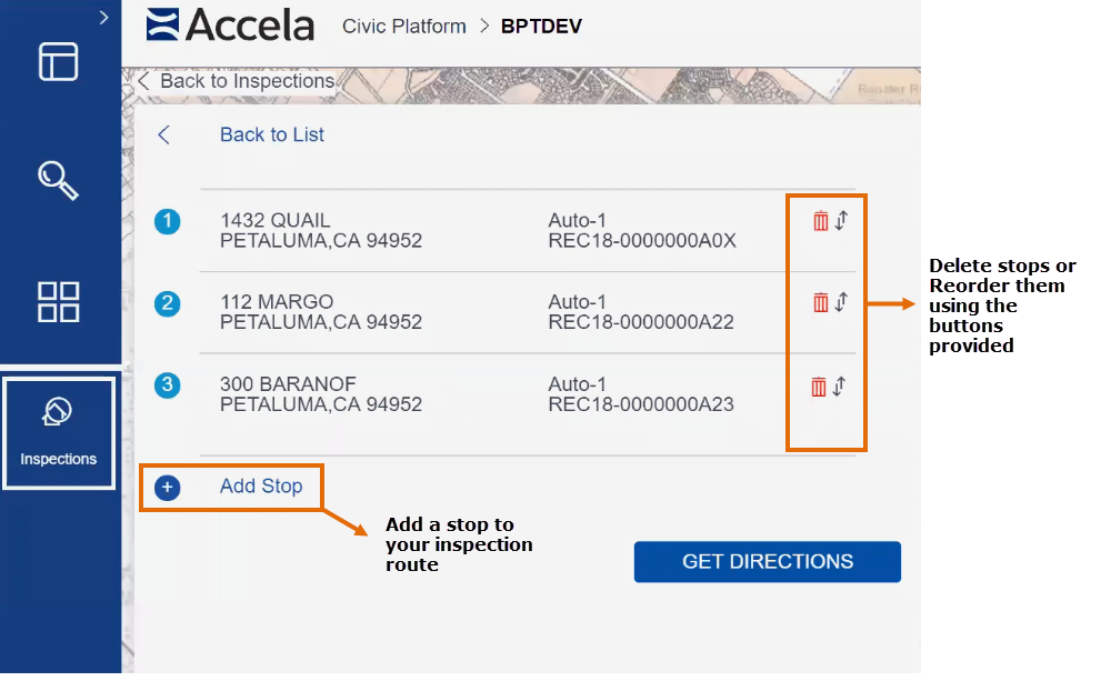 When satisfied with the changes and ready to view the inspection route, click Get Directions. Any changes made before clicking Get Directions are then updated in the database. Scroll down to view turn-by-turn directions.